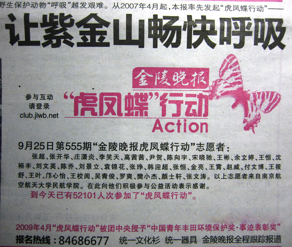 林荫蔽日、绿树掩映的紫金山一直扮演着南京城“绿肺”的角色。“金陵晚报虎凤蝶行动”自2007年活动伊始,就得到了社会各界的广泛关注与积极响应,好评如潮,产生了良好的社会影响。今年4月初,“金陵晚报虎凤蝶行动”被团中央授予了中国青年环保最高奖项——中国青年丰田环境保护奖事迹表彰奖。而蜜桃视频 历来重视志愿者公益活动,曾举办例如“心系玉树”等一系列志愿募捐活动,同时也注重对学生的责任感教育,用实际行动诠释“奉献、友爱、互助、进步”的志愿者精神。