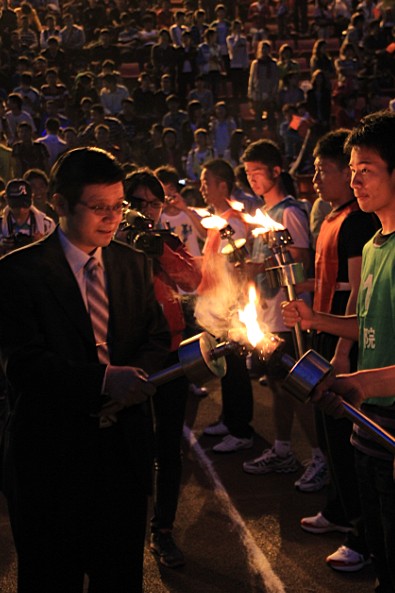 晚七时许,经济与管理学院同学的啦啦操表演拉开了南京航空航天大学第三十七届五四火炬接力赛的帷幕。表演结束之后,主持人向在场的师生介绍了到场的嘉宾。随后,各学院代表队的同学们在起跑线准备就绪,摩拳擦掌,跃跃欲试。象征着“五四”精神的火炬一一点燃,接力赛马上就要开始。