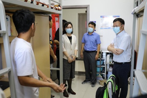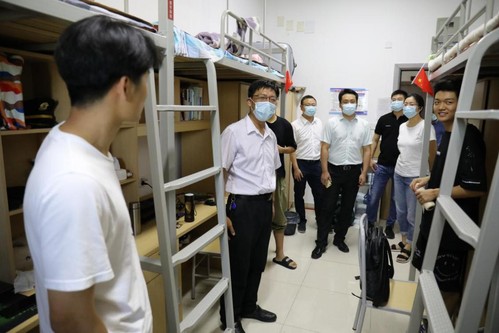 8月17日,蜜桃视频 (飞行学院)全体领导班子成员带队深入天目湖校区学生宿舍,慰问并了解学生返校入学情况,系主任、教工支部书记、党政办主任及组织员随同参加。
