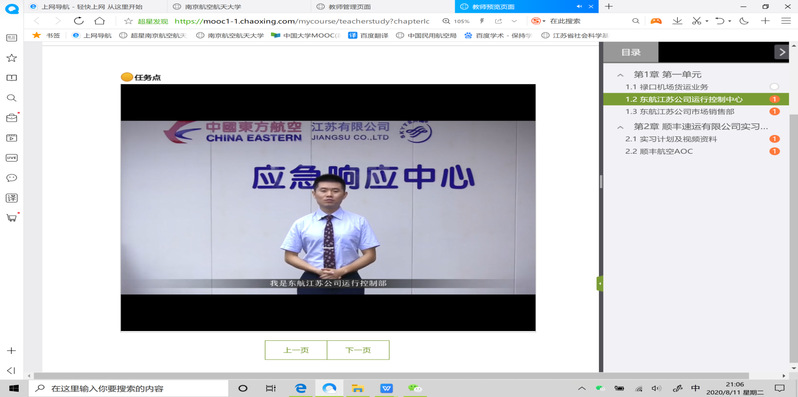 视频拓展是校内指导老师在东航江苏公司拍摄的航空公司生产运行的讲解视频,其中包括了东航江苏公司市场部、飞行签派部、航空情报部、运行保障部的专家向同学们介绍了市场部、运行控制中心的分工和主要职责,以及他们在平时工作中所注重的基本能力和核心工作理念。