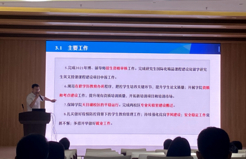 院长孙建红从党建工作、师资队伍建设、专业建设、学科科研,岗位评聘、国际合作与研究生培养、学生教育管理及疫情下的工作等方面,对学院上半年工作进行了全面的回顾和总结,围绕“民航特色发展、全校办民航”态势,对学院的工作难点及对策进行了分析和解读,结合学校干部教师会议精神对学院下半年重点工作进行了布置和规划。