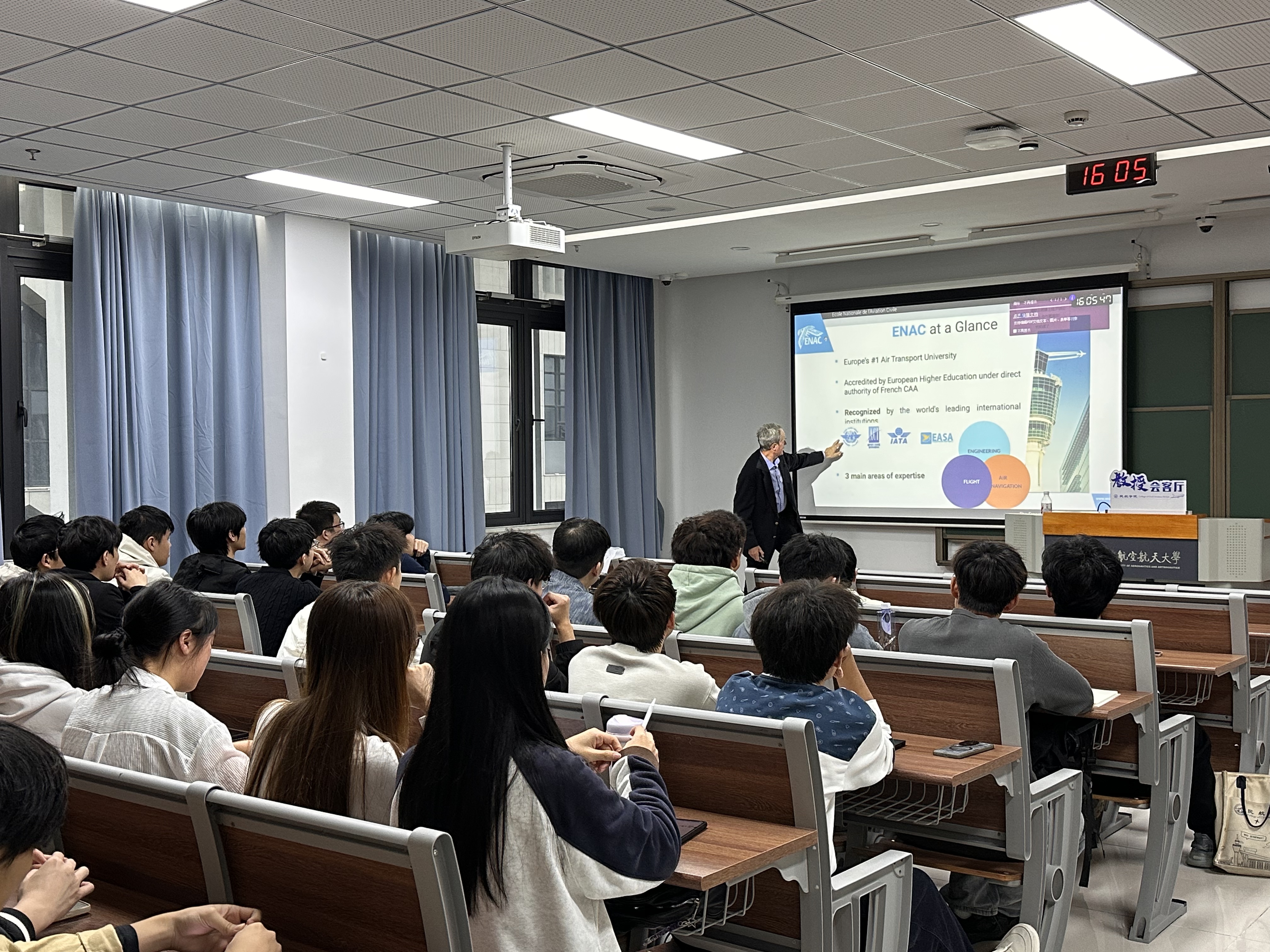 为帮助学生深入了解人工智能技术在空中交通管理(Air Traffic Management,ATM)领域的前沿应用与未来发展,10月30日,蜜桃视频 在天目湖校区T2311教室举办《AI FOR ATM》专题讲座。讲座特邀外籍教授Daniel Delahaye进行全英文讲授,空管系教师王艳军、辅导员王雨薇和2024级空管专业全体学生参与。