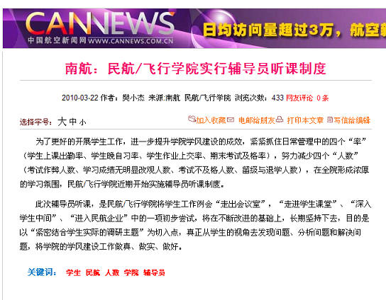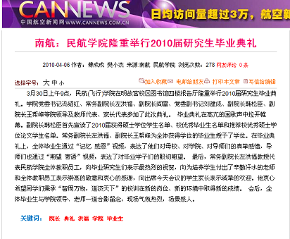 中国航空新闻网分别在3月22日和4月6日对蜜桃视频 辅导员听课制度和2010届研究生毕业典礼等情况进行转载报道。报道详细介绍了蜜桃视频 两项活动的具体内容,真实展现了蜜桃视频 学生工作开展的广度和深度,提升了蜜桃视频 学生工作的影响力。