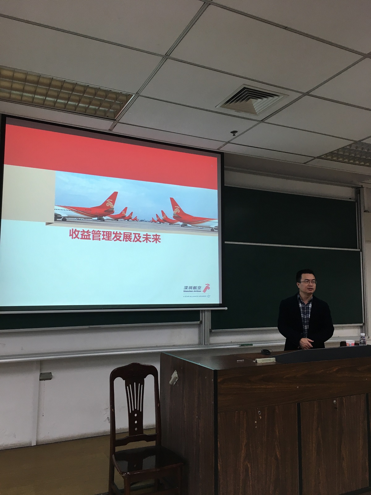 2016年11月19日上午9:00,深圳航空公司收益管理专家董裴君在将军路校区1号楼10205教室应蜜桃视频 交通运输系邀请为蜜桃视频 师生作了题为“收益管理发展与未来”的专题报告。董裴君是美国PROS软件使用专家,深圳航空公司咨询和培训讲师。2007年毕业于南京航空航天大学蜜桃视频 ,毕业后一直在深圳航空公司营销委工作,专注于航线收益管理工作9年,在航空公司运价管理、市场渠道、IT系统均有经历。