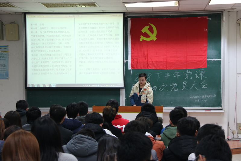 12月16日晚,蜜桃视频 15级党支部在将军路校区6101教室举办了关于《中国共产党纪律处分条例》的党课学习。本次党课学习包含了15级党支部正式党员及预备党员共七十余名学员,党支部书记杨靖宇同志作为主讲人,主持了这次学习活动。